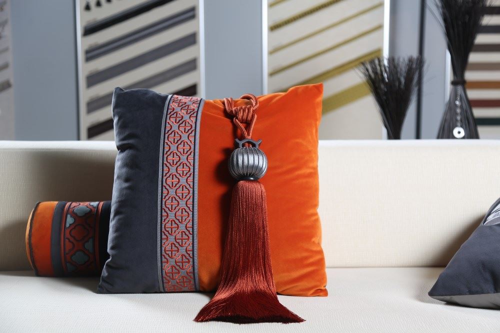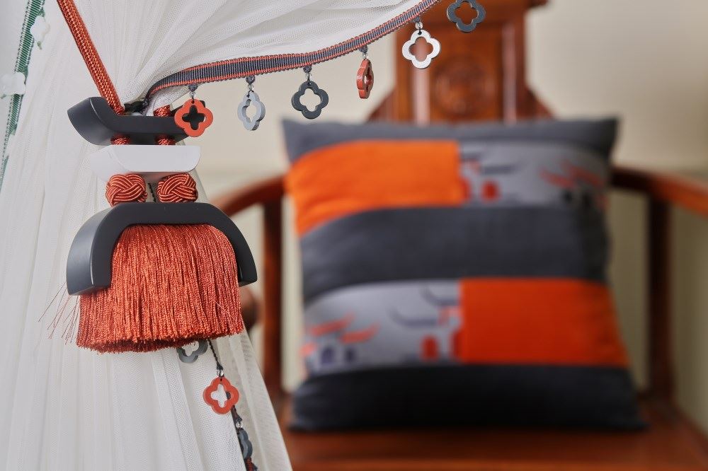 我們依據(jù)梅花窗的圖案,設計了兩款帶子,搭配窗簾和抱枕,把江南唯美的文化氛圍,通過與布藝的結合置入中式家居。
